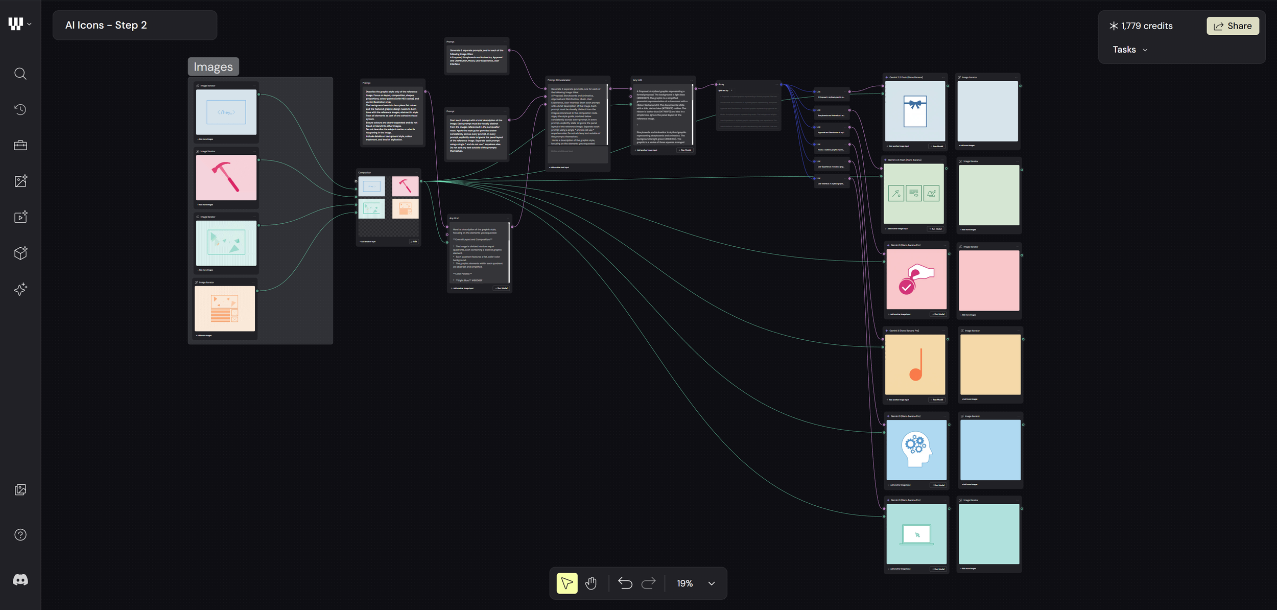 Through a mix of LLM nodes and prompt separators, I was then able to guide the AI to create a new set of themed icon designs based on those original references. The idea was to generate something comparable, and then stack the results up against the original animated icons I’d created, just to see how they really held up.